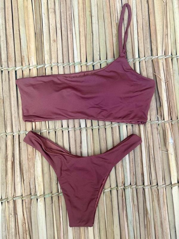 Este biquíni asa delta possui design assimétrico com top de um ombro só, criando um visual moderno e exclusivo. A calcinha cavada valoriza perfeitamente sua silhueta, alongando o corpo e destacando suas curvas.