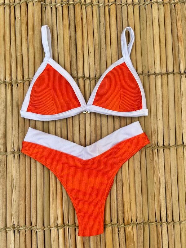 Biquíni asa delta laranja vibrante com amarração nas costas. Modelo clássico que adiciona cor e alegria ao visual praiano com conforto e estilo.