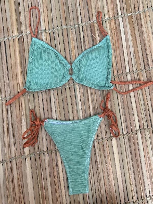 Este deslumbrante biquíni verde água combina a cor refrescante com design inteligente. O top com amarração central permite ajuste personalizado para ótima sustentação e conforto, adaptando-se perfeitamente ao seu busto.