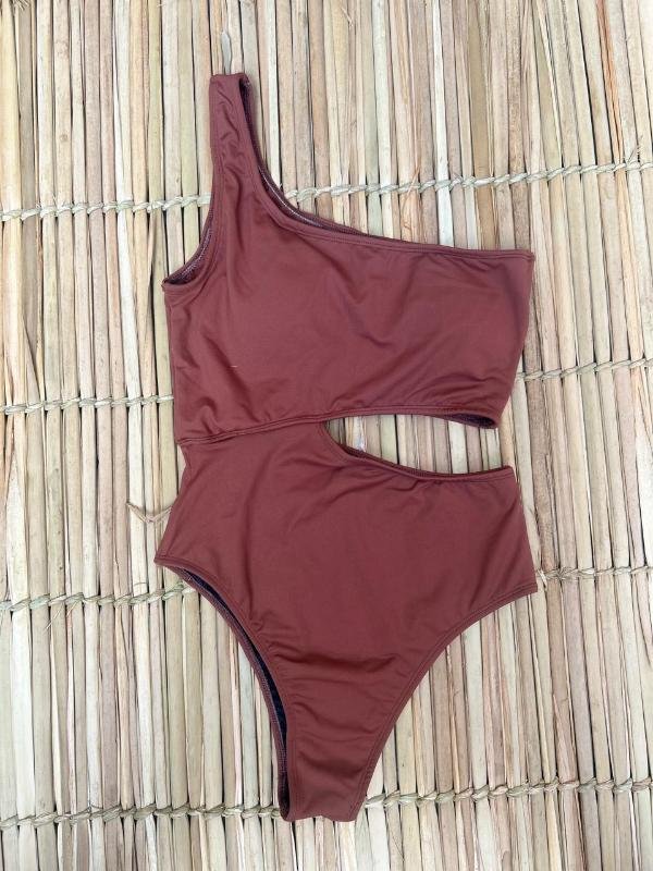 Maiô marrom elegante com um ombro só e recorte frontal estratégico. Modelo moderno que valoriza o colo e realça a silhueta com sofisticação.