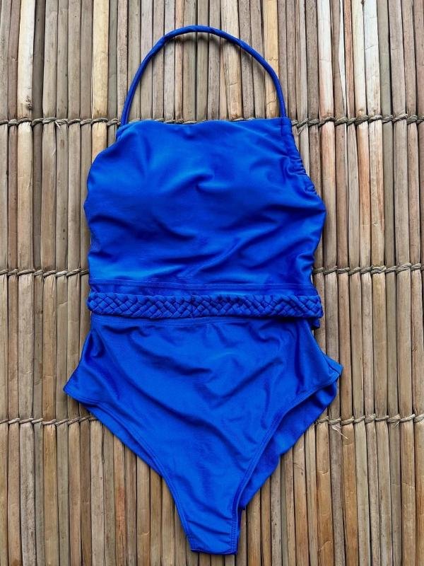Maiô azul elegante com amarração no pescoço e detalhe trançado na cintura. Decote reto que valoriza a silhueta com sofisticação.